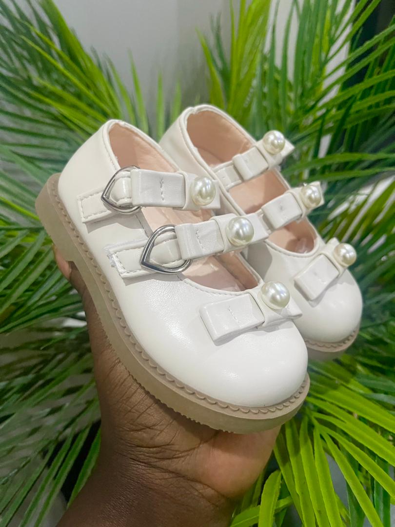 - White baby shoes with buckles and pearls