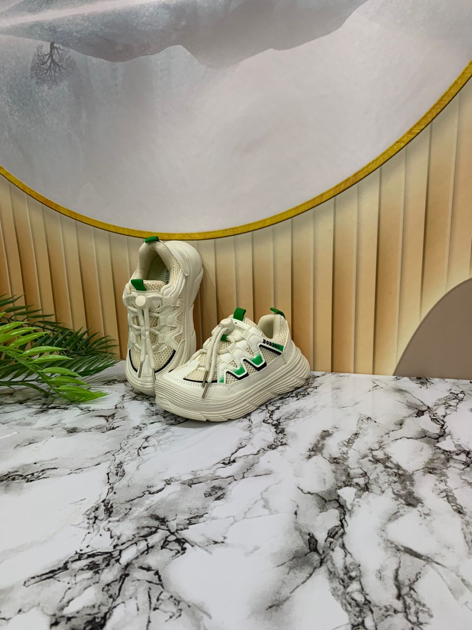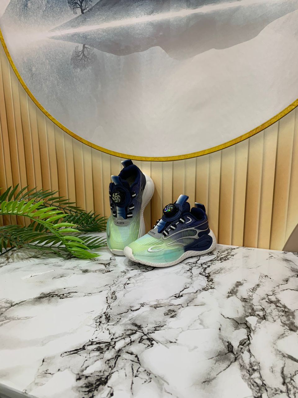 - Children's blue and green sneakers on a marble table.