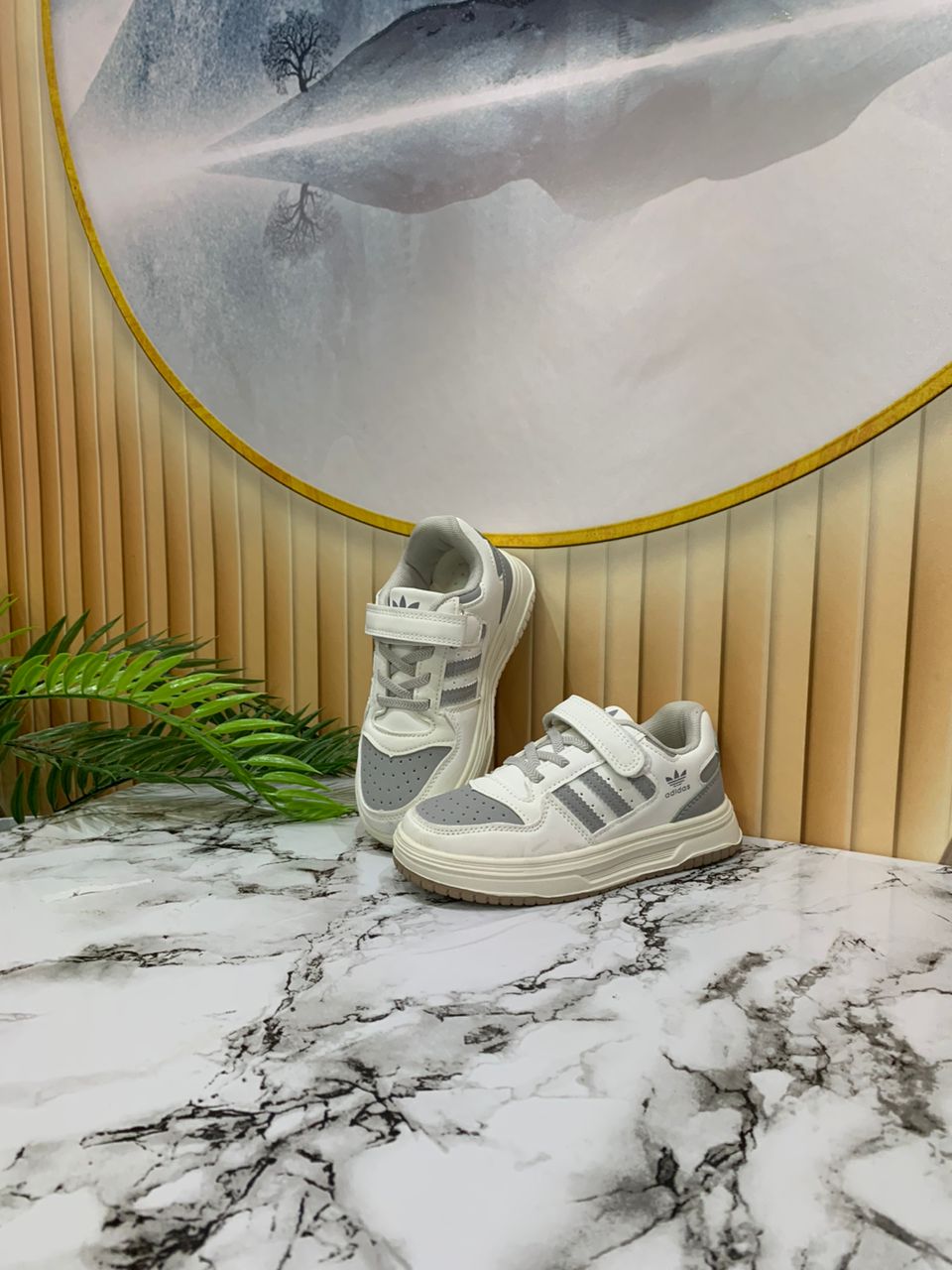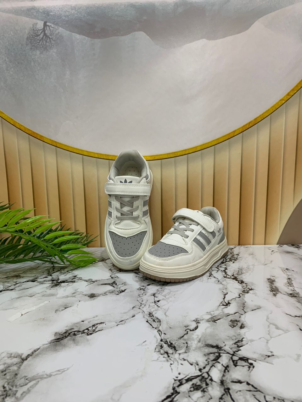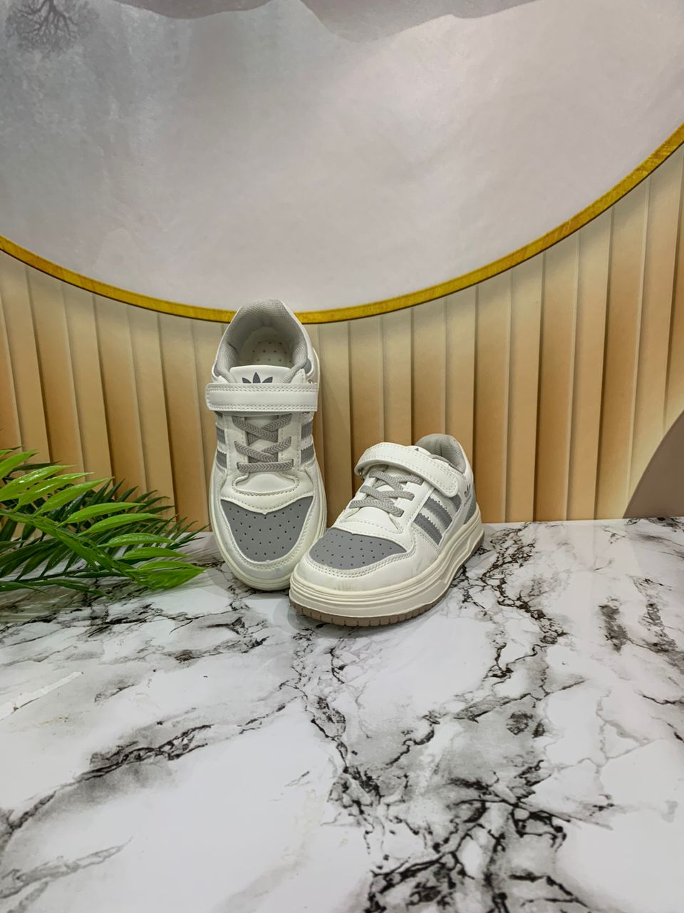 - White and grey baby sneakers with Velcro straps