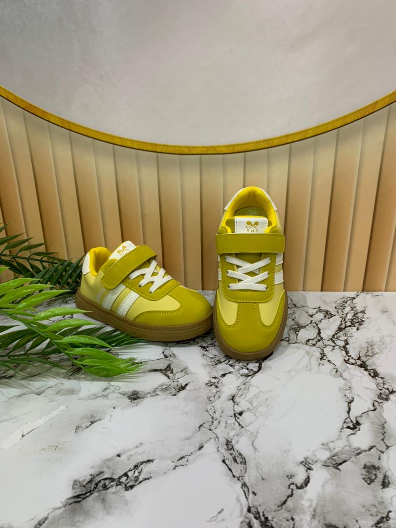 - Yellow toddler sneakers with white stripes