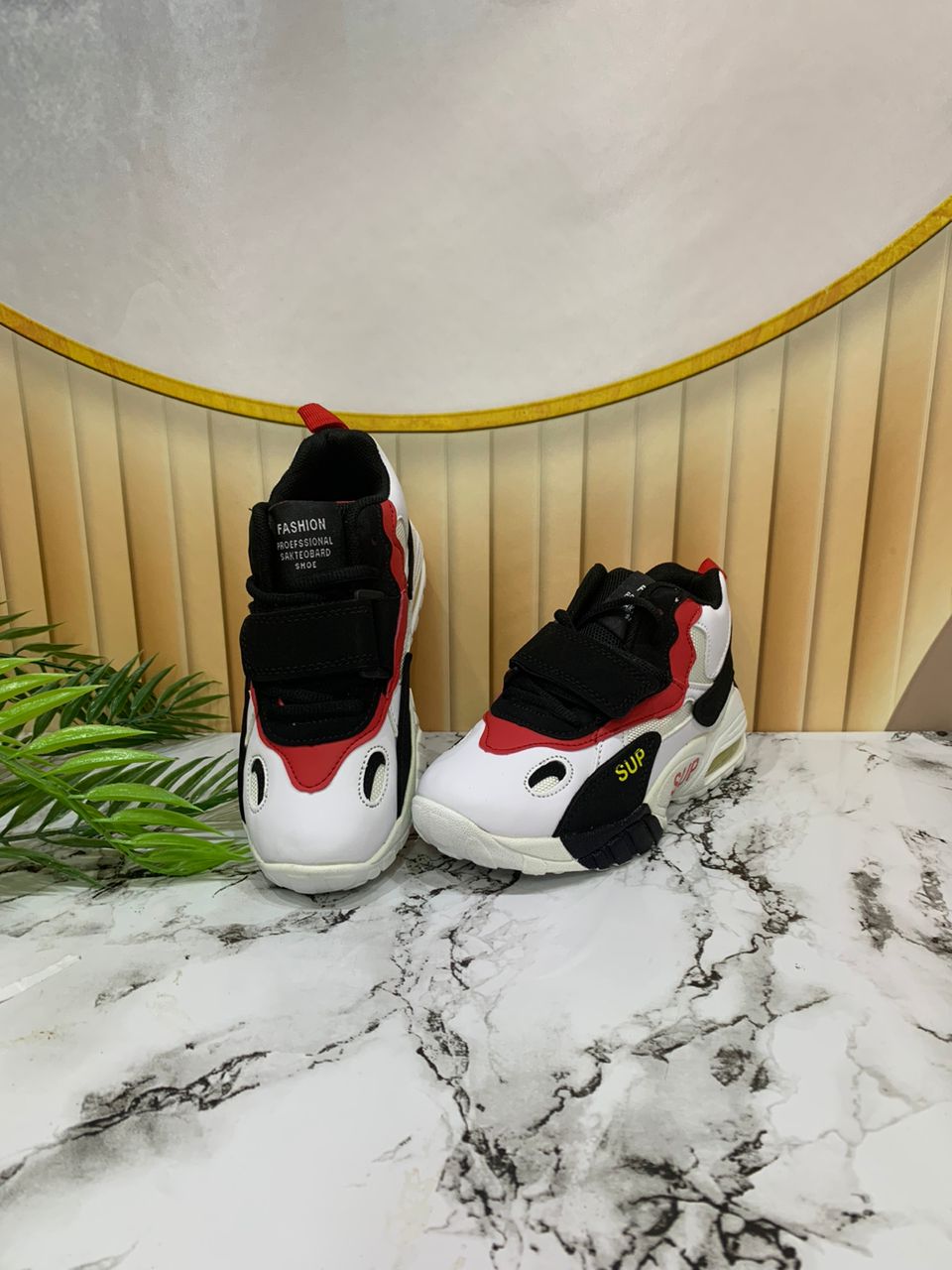 - White, red, and black baby sneakers