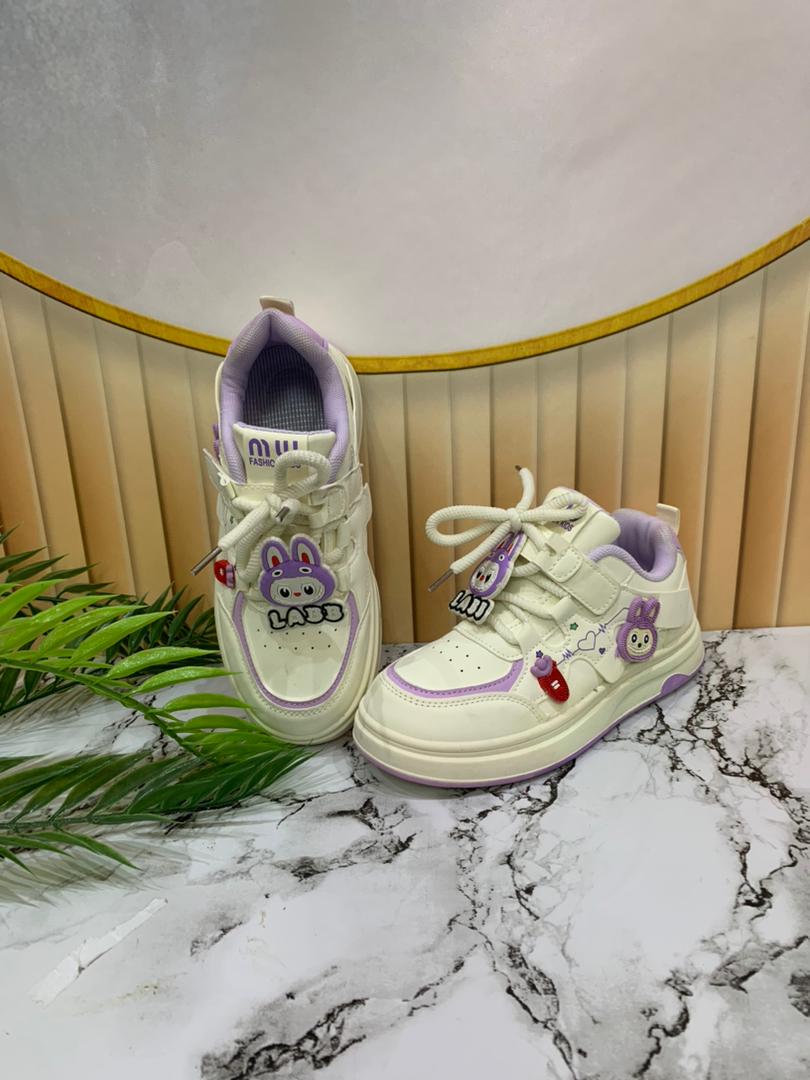 - Cream children's shoes with purple details and cartoon charms