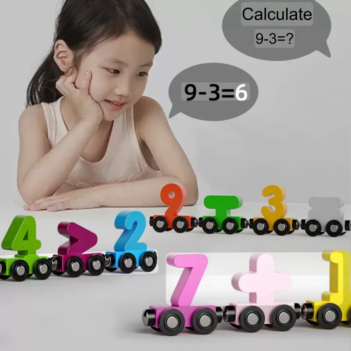 - Girl with colorful number train toys and math problems